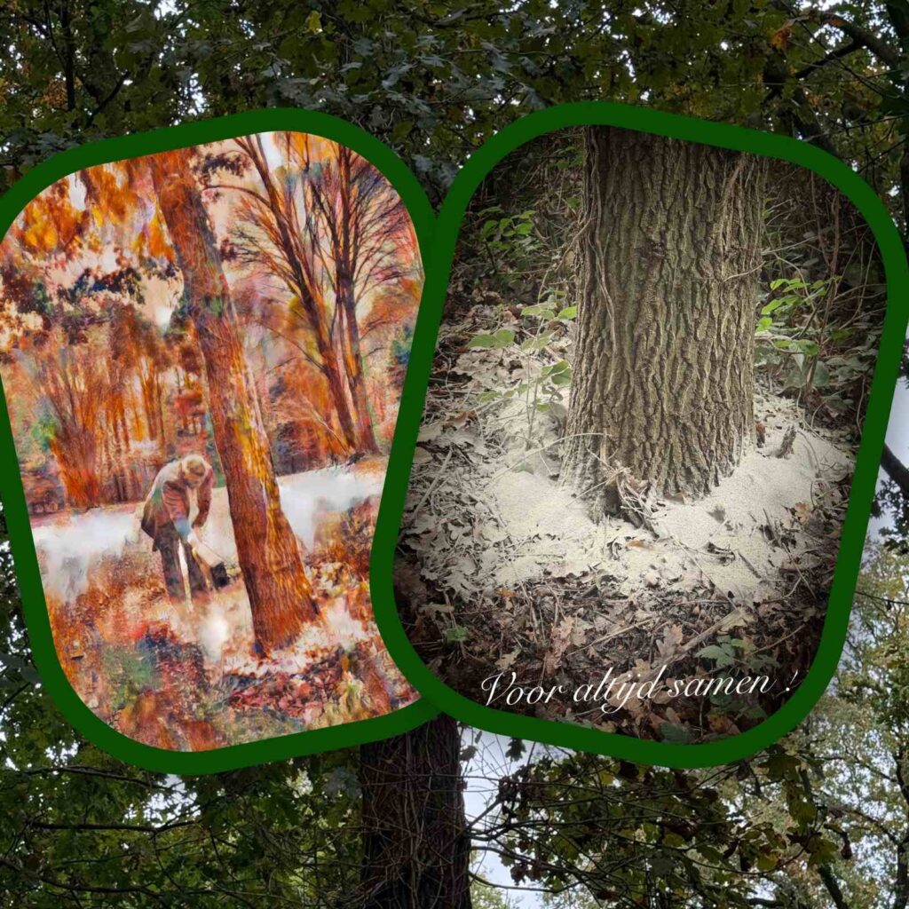 Ik mocht hen namens de familie uitstrooien. Een mooie plek was uitgezocht en zo strooiden we eerst mevrouw in een cirkel rond een sterke eik en daarna haar man. De cirkel, als symbool van de eeuwigheid en ook dat liefde niet stopt bij de dood, maar eeuwig is. Maar ook dat ze nu voor eeuwig samen zijn.